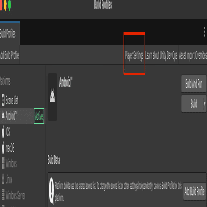 方法B: [File] > [Build Settings] を開き、下部の [Player Settings] ボタンをクリック